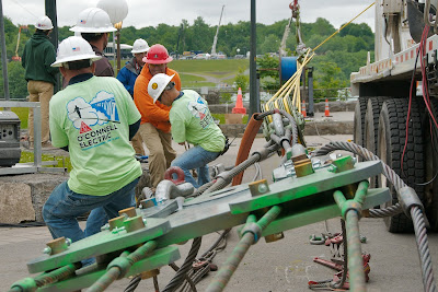 Above: Crews utilize a six-part-purchase to manually pull the Cable the last few feet before attaching it to the yoke plate on the Canadian side. Cable tension was more than 30,000 pounds.