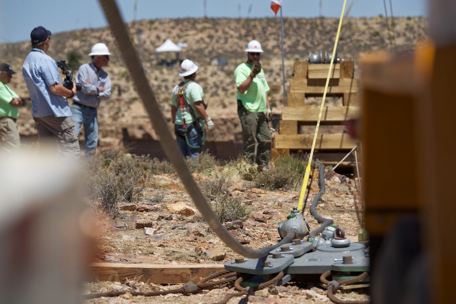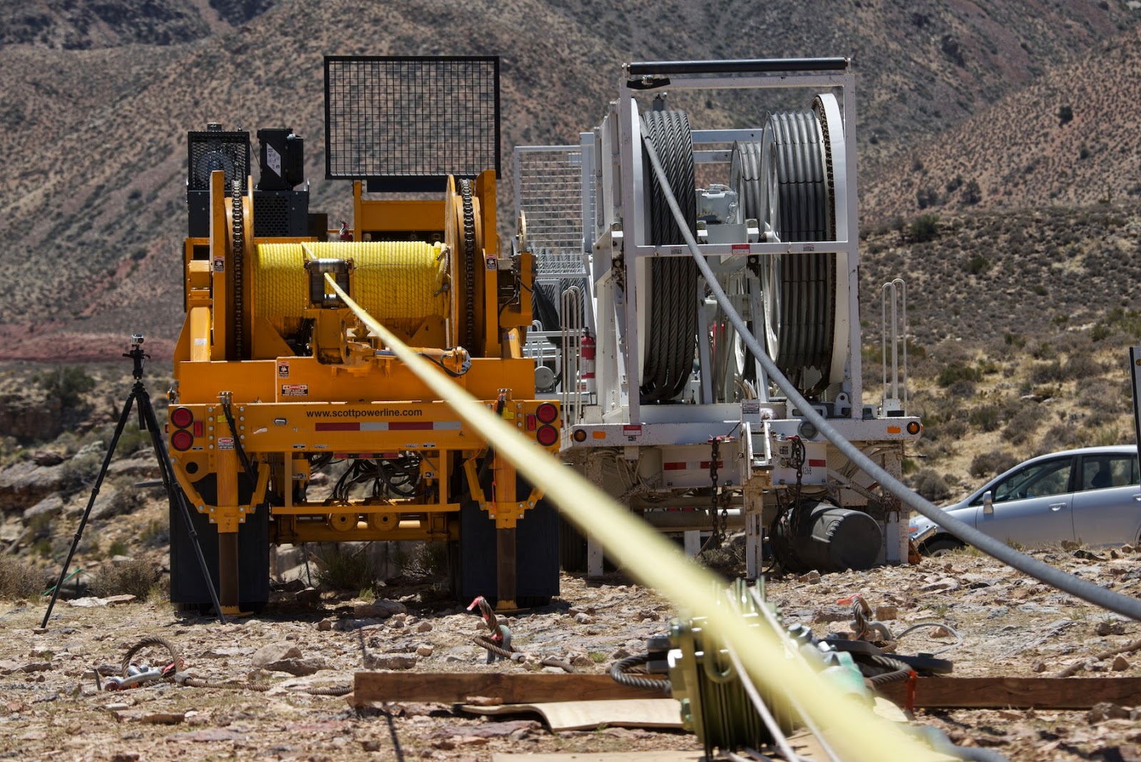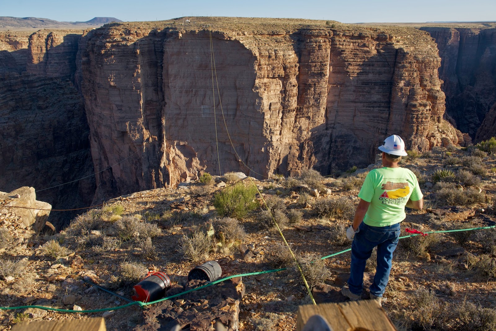 At 5:23 am on day four the helicopter arrived at the job site—no one wanted to risk the wind building again. Crews made the leader rope ready that day and positioned the shackle end of the cable just over the precipice of the canyon.
